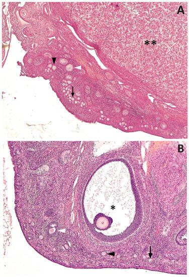 Ovarian tissue of two late anestrous beagle bitches that were serially administered 330 μg/kg SC acyline for 60 days and then spayed 45 days later. (A): Corpus luteum (asterisks), primordial follicle (black arrow), primary follicle (black arrow head), secondary follicle (white arrow head). (B): Antral follicle (asterisk), primordial follicle (black arrow), primary follicle (black arrow head), secondary follicle (white arrow head). H&E, 40×.
