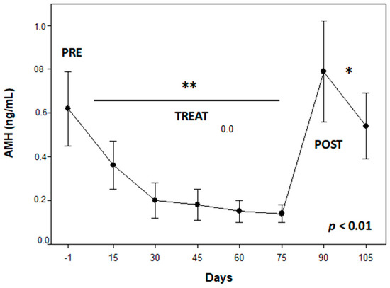 PRE AMH concentrations were 0.62 ± 0.17 ng/mL. This hormone varied throughout the study period (p < 0.01; Figure 2), diminishing to nadir values during TREAT to then rapidly recover in the POST phase (0.2 ± 0.05 vs. 0.67 ± 0.22 ng/mL; p < 0.01). The gonadosomatic index was correlated with day 105 AMH concentrations (0.95, p < 0.05).