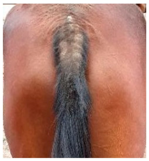 Lesions caused by IBH are well recognised by horse owners and veterinary practitioners [4]. Bites from the offending insects cause a hypersensitivity reaction which presents clinically as severe pruritus. Most of the lesions characteristic of this disease develop from the self-trauma (scratching and rubbing) inflicted in response to this pruritus [1]. These lesions include alopecia, crusting, ulcers, lichenification and pigmentary alterations [1,5] (Figure 1, Figure 2 and Figure 3). Lesions can be severe with oozing, bleeding and purulence from secondary bacterial and yeast infections. Secondary infections in addition to a more pervious skin barrier may also contribute to the continued pruritus [1]. Urticaria may also be present [5] (Figure 4). In contrast to the characteristic lesions that occur secondary to the intense pruritus, urticaria is a primary lesion caused by the degranulation of dermal mast and other cells releasing histamine, platelet-activating factors and prostaglandins [6]. Horses can also develop behavioural changes in response to persistent pruritus and lesions [1,5].