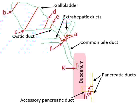 Diameter measurements were taken from the lumen of the ducts and GB (inner diameter; not including the wall itself) as follows: (a) left and right extrahepatic ducts—at the beginning of the ducts entering the CBD; (b, c, d) GB in three sites—fundus, body, and neck; (e) cystic duct— leaving the GB; (f, g) CBD—at extrahepatic ducts’ junction and at major duodenal papilla; and (h) right and left pancreatic ducts—at the beginning of the ducts leaving the accessory pancreatic duct (Figure 1).