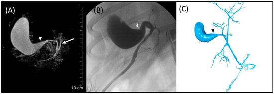 Images of Dog 8 with acute extrahepatic cholestasis and focal destructive cholangitis. (A) 3D-TSE-MRCP illustrating dilated gallbladder neck (arrowhead). Normal left extrahepatic duct is visible (arrow). (B) FRCP image showing dilated gallbladder neck (arrowhead). (C) Corrosion cast demonstrating dilated gallbladder neck (arrowhead).