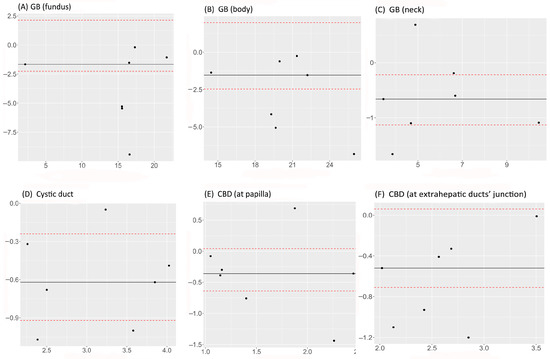 There was a statistically significant concordance between MRCP and FRCP in measuring the GB and cystic duct. The strongest concordance was in measuring the GB neck (0.91; 95% CI 0.62–0.98). The concordance between MRCP and FRCP in measuring the CBD was not statistically significant (Table 5). Bland–Altman plots indicated statistical agreement between MRCP and FRCP for measuring the GB fundus, GB body, CBD at papilla, and CBD at the extrahepatic ducts’ junction as the null value was included in the 95% LoA (Figure 4A,B,E,F). On the other hand, Bland–Altman plots showed that MRCP and FRCP were not statistically comparable for the GB fundus, GB body, and CBD at the extrahepatic ducts’ junction, as all seven measurements were below the null value (Figure 4A,B,F).