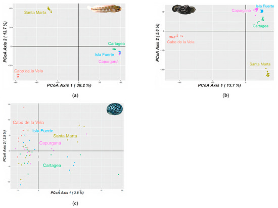 Principal component analysis (PCA) for (a) Acanthemblemaria rivasi, (b) Cittarium pica, and (c) Nerita tessellata across the southern Caribbean Sea, Colombia sector. The percentage of variation is exhibited by two axes.