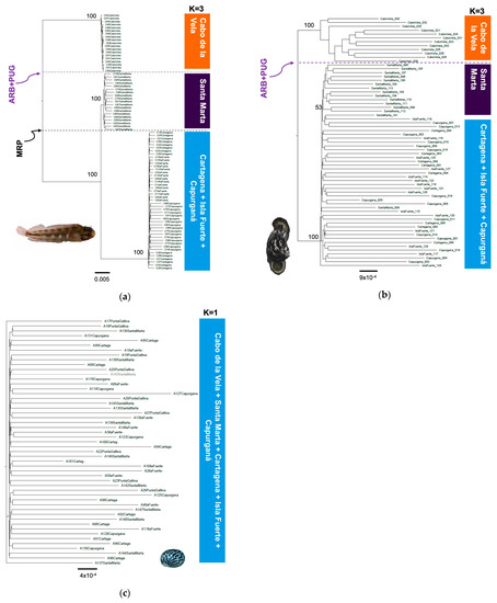 Phylogenetic trees constructed with the maximum likelihood method with the SNP matrix and the representation of the results of the STRUCTURE analysis indicating the most likely K number and related localities in the southern Caribbean (Colombia sector) for (a) A. rivasi, (b) C. pica, and (c) N. tessellata. The dotted lines indicate putative barriers (MRP: Magdalena River plume; ARB + PUG: the combination of the absence of a rocky bottom and the almost permanent upwelling in La Guajira).