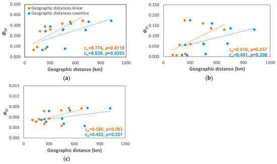 Only A. rivasi showed a significant correlation between the genetic distance and linear and coastline distances (rm coastline = 0.623, p = 0.0253; rm linear = 0.774, p = 0.0118; Figure 4a), but no significant correlations were found for C. pica (rm coastline = 0.441, p = 0.2059; rm linear = 0.616, p = 0.0571; Figure 4b) and N. tessellata (rm coastline = 0.422, p = 0.227; rm linear = 0.580, p = 0.0831; Figure 4c) was not significant. However, the Mantel correlogram indicated that A. rivasi and C. pica fit the hierarchical population model (Figure S2).