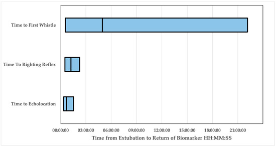 The time to return of the righting reflex (Mean (M) = 01:13:44 HH:MM:SS, Standard Error (SE) = 00:09:02; Range = 00:31:00–02:16:00) following extubation was used as a previously established biomarker of anesthetic emergence. The time to return of echolocation (M = 00:43:41, SE = 00:06:28, Range 00:21:58–01:32:09) and the time to whistle (M = 04:57:47, SE = 02:22:31, Range 00:28:57–22:08:08) following extubation were assessed as novel biomarkers of emergence (Table 2, Figure 2). In 9/12 events, dolphins recorded whistling during the emergence period and began whistling only after echolocating.