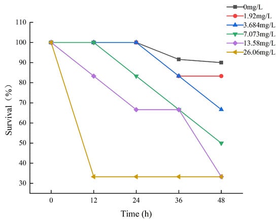 The results of the survival of large yellow croakers exposed to 0 mg/L, 1.92 mg/L, 3.684 mg/L, 7.073 mg/L, 13.58 mg/L, and 26.06 mg/L total ammonia nitrogen for 48 h, respectively.