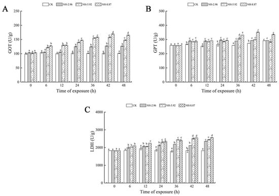 Changes in glutamic oxalate transaminase (GOT) (A), glutamic pyruvate transaminase (GPT) (B), and lactate dehydrogenase (LDH) (C) activities in the livers of large yellow croakers exposed to 0 mg/L (CK), 2.96 mg/L (NH-2.96), 5.92 mg/L (NH-5.92), and 8.87 mg/L (NH-8.87) total ammonia nitrogen for 48 h, respectively. Values are expressed as the mean ± S.D. Different lowercase letters indicate significant differences (p < 0.05) among groups. The CK nitrite group served as the control.