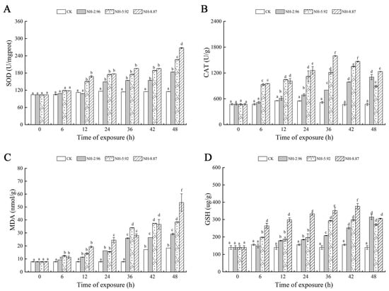 Figure 3 shows the oxidative stress and oxidative damage at 48 h of ammonia exposure. The superoxide dismutase and malondialdehyde contents of the experimental groups exposed to ammonia increased with time. The superoxide dismutase and malondialdehyde contents of each experimental group peaked at 48 h, and the peaks were significantly higher than those of the CK group. The catalase and glutathione contents of the NH-5.92 and NH-8.87 experimental groups increased with the increase in exposure time, and then began to decrease. The peak of catalase activity in NH-5.92 and NH-8.87 experimental groups appeared at 42 h and 36 h, respectively. The peak of catalase activity in both NH-5.92 and NH-8.87 experimental groups appeared at 36 h.