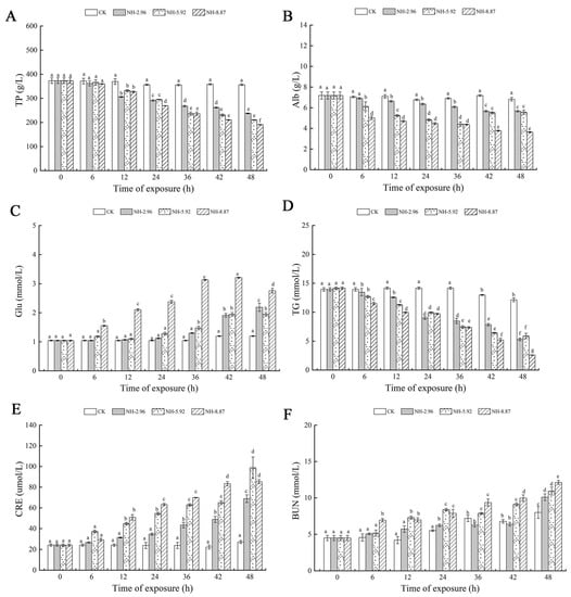 Changes in total protein (TP) (A), albumin (Alb) (B), glucose (Glu) (C), triglyceride (TG) (D), creatinine (CRE) (E), and blood urea nitrogen (BUN) (F) levels in the serum of large yellow croakers exposed to 0 mg/L (CK), 2.96 mg/L (NH-2.96), 5.92 mg/L (NH-5.92), and 8.87 mg/L (NH-8.87) total ammonia nitrogen for 48 h, respectively. Values are expressed as the mean ± S.D. Different lowercase letters indicate significant differences (p < 0.05) among groups. The CK nitrite group served as the control.