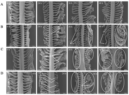 Scanning electron microscope (SEM) micrographs of the large yellow croaker gills exposed to 0 mg/L (CK, (A)), 2.96 mg/L (NH-2.96, (B)), 5.92 mg/L (NH-5.92, (C)), and 8.87 mg/L (NH-8.87, (D)) total ammonia nitrogen for 0 h, 24 h, 36 h, and 48 h. Bars = 200 µm. Whitehead arrows and circles indicated gill morphological changes.