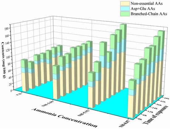 The total content of FAAs showed gradually increasing trends in ammonia-treated samples compared with CK (Table 2). The nonessential amino acid contents of fish flesh had similar trends as the total content of FAAs (Figure 6). The branched-chain amino acids in NH-5.92 and NH-8.87 were higher than CK during the ammonia exposure process.