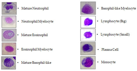 At the end of the 4-week experiment, 5 gilthead sea bream were randomly selected from each of the 9 floating cages (45 fish—15 per group). Blood samples were obtained from the caudal vein of every fish using a 20 G × 1½ syringe without any anticoagulant agent to assess the differential leukocyte count (DLC) [58]. Blood smears were taken immediately given the rapid blood clotting of gilthead sea bream. A blood drop (without anticoagulants) was applied on a degreased glass slide and was smeared out, dried at room temperature, fixed with methanol, and stained (Hemacolor® Rapid Staining Set (Merck KGaG, Darmstadt, Germany). Each smear was divided into 6 randomly selected areas of 1 mm2, and the absolute percentage of each type of white blood cell was counted (lymphocytes, neutrophils, eosinophils, monocytes, and their blast forms were calculated as a percentage). Smears were studied using an Olympus CX23 light microscope. The cellular size, nuclear morphology, and cytoplasmic staining patterns were the criteria for the cells’ identification and determination [59,60,61]. The DLC was recorded as a percentage of a particular cell type [58]. Mature and blastic cells were involved in the leukogram (Figure 2), but thrombocytes and thrombocyte-like cells were excluded in the white blood cell parameters, since they represent a distinct blood cell type [62]. A total of 270 (45 fish smears × 6 randomly selected divisions/smear) blood assays were conducted.