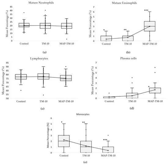Figure 3. Box-and-whisker plots of mean percentage of mature neutrophils (a), mature eosinophils (b), lymphocytes (c), plasma cells (d), and monocytes (e) of the three experimental groups. Significant differences among groups are denoted with asterisks (* p < 0.05; ** p < 0.01; *** p < 0.001). The empty circles in the boxplots denote values being identified as outliers.