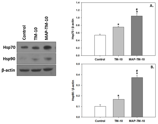 Figure 4. Levels of Hsp70 (A) and Hsp90 (B) (mean ± SEM) in the whole blood of S. aurata under the control, TM-10, and MAP-TM-10 feeding regimes. The quantitative histograms show the changes in the abovementioned indicators, normalized with β-actin. Representative blots are shown. n = 5 preparations from different animals. Significant differences (p < 0.05) compared to the control are presented as *, while significant differences (p < 0.05) between TM-10 and MAP-TM-10 are presented as #.