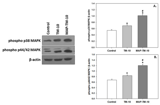 Figure 5. Phosphorylated levels of p38 MAPK (A) and p44/42 MAPK (B) (mean ± SEM) in the whole blood of Sparus aurata under the control, TM-10, and MAP-TM-10 feeding regimes. The quantitative histograms show the changes in the abovementioned indicators, normalized with β-actin. Representative blots are shown. n = 5 preparations from different animals. Significant differences (p < 0.05) compared to the control are presented as *, while significant differences (p < 0.05) between TM-10 and MAP-TM-10 are presented as #.