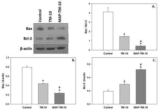 Figure 6. Levels of Bax/Bcl-2 ratio (A), Bax (B), and Bcl-2 (C) (mean ± SEM) in the whole blood of Sparus aurata under the control, TM-10, and MAP-TM-10 feeding regimes. The quantitative histograms show the changes in the abovementioned indicators, normalized with β-actin. Representative blots are shown. n = 5 preparations from different animals. Significant differences (p < 0.05) compared to the control are presented as *, while significant differences (p < 0.05) between TM-10 and MAP-TM-10 are presented as #.