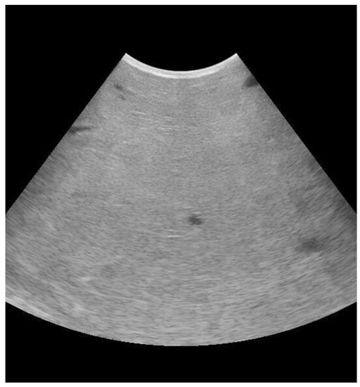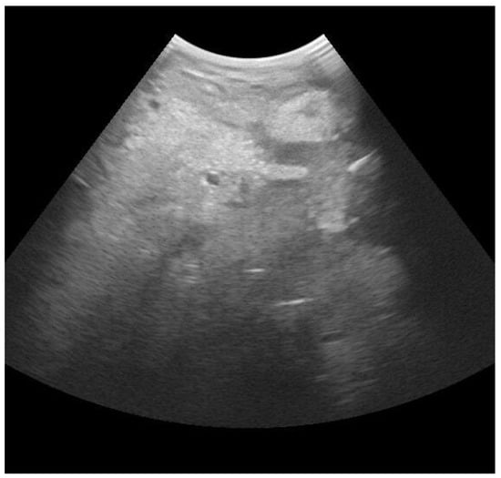 Many studies have demonstrated the utility of mammary ultrasound in identifying the presence of lesions or alterations of the mammary parenchyma and the teat, as well as in providing a valid indication of the outcome of treatment based on this evidence. Moreover, the possibility of pre-identifying animals for which intramammary antibiotic treatment could be ineffective would be an important element both in terms of antimicrobial resistance and for the economic impact of the disease itself [56,57,58,59]. The echographic examination of the mammary gland parenchyma in ruminant animals is performed primarily via the direct contact technique (transcutaneous echography). For this purpose, a linear, convex, or sector transducer can be used [56]. Ultrasonography of the normal udder parenchyma shows homogenous hypoechogenic parenchyma with interspersed anechoic blood vessel, milk alveoli, and lactiferous duct (Figure 1).