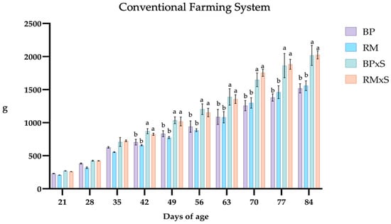 Weekly recorded live weight (g) of the four genotypes reared in the conventional system. Abbreviations: BP, Bionda Piemontese; RM, Robusta Maculata; BP × S, Bionda Piemontese × Sasso; RM × S, Robusta Maculata × Sasso. a, b values differ significantly. p-values are considered significant when p < 0.05.