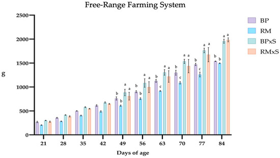 The data related to the weekly growth performance traits are shown in Figure 1 and Figure 2. The two crossbreeds started showing higher weights around 42 days of age (Figure 1 and Figure 2). In the F system, RM had the lowest weights at 63, 70, and 77 days of age (Figure 2), while no differences between BP and RM were found in the C farming system.