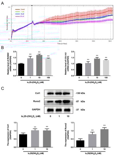 It has been previously reported that lα, 25-(OH)2D3 has multiple regulatory effects, including cell proliferation and cell differentiation [20]. To detect the effects of lα, 25-(OH)2D3 on the proliferation of BMSCs from chicken embryos in vitro, the cell index was monitored using a RTCA dynamic system. The data showed that the BMSCs enters the logarithmic growth phase after treatment with lα, 25-(OH)2D3 for 24 h. Then, the cell index was observed with supplementation with different concentrations of lα, 25-(OH)2D3 (1, 10, and 100 nmol/L); the cell index was normalized to analyze the difference, and the cell index in the 100 nmol/L lα, 25-(OH)2D3 group was lower than the other groups. However, in terms of cell index, there was no difference between 1 and 10 nmol/L lα, 25-(OH)2D3 (Figure 1A). Next, the mRNA levels of RUNX2 and COL1A2 were measured by qRT-PCR after treatment with different concentrations of lα, 25-(OH)2D3; it was found that 10 nmol/L lα, 25-(OH)2D3, more than 10 nmol/L, significantly increased their levels compared with 0 nmol/L lα, 25-(OH)2D3 (Figure 2B). Correspondingly, the expression of Col1 and Runx2 were enhanced after treatment with 1 and 10 nmol/L lα, 25-(OH)2D3 compared with 0 nmol/L lα, 25-(OH)2D3 (Figure 2C). These data indicated that lα, 25-(OH)2D3 promoted the osteogenic differentiation of BMSCs from chickens.