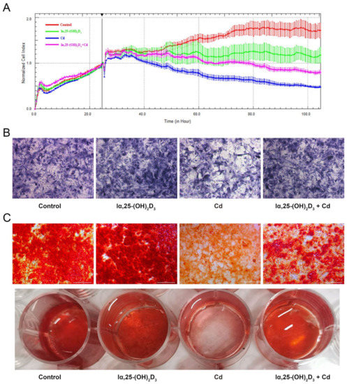 The effects of lα, 25-(OH)2D3 on Cd-inhibited osteogenic differentiation of BMSCs from chickens in vitro. (A) Cell index of BMSCs was monitored by the RTCA dynamic system after treatment with different groups. (B,C) The activity of ALP and the orange-red calcified nodules in BMSCs were observed using ALP staining and Alizarin red staining after treatment with different groups, respectively. (Control: only cells, lα, 25-(OH)2D3: 10 nmol/L; Cd: 5 μmol/L and lα, 25-(OH)2D3 + Cd: 10 nmol/L + 5 μmol/L, respectively).
