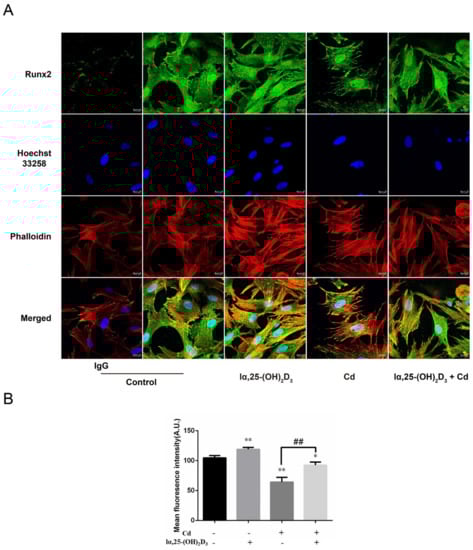The distribution of Runx2 during lα, 25-(OH)2D3 on Cd-inhibited osteogenic differentiation of BMSCs from chickens in vitro. (A) Green fluorescence indicates the Runx2 distribution using a primary antibody, blue indicates the nucleus using the Hoechst 33258 dye, and red indicates the F-actin using a Phalloidin dye. (B) The mean fluorescence intensity of Runx2 was analyzed after treatment with different group. * p < 0.05, ** p < 0.01 vs. Control group; ## p < 0.01 vs. Cd group. (Control: only cells, lα, 25-(OH)2D3: 10 nmol/L; Cd: 5 μmol/L and lα, 25-(OH)2D3 + Cd: 10 nmol/L + 5 μmol/L, respectively).