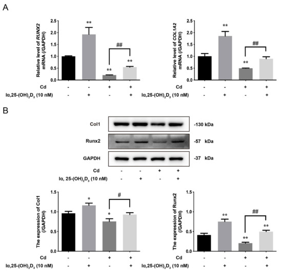 The effects of lα, 25-(OH)2D3 on markers of Cd-inhibited osteogenic differentiation of BMSCs from chickens in vitro. (A) The mRNA levels of RUNX2 and COL1A2 in BMSCs were measured by qRT-PCR after treatment with different groups. ** p < 0.01 vs. Control group; ## p < 0.01 vs. Cd group. (B) The expression of Col1 and Runx2 in BMSCs were detected by Western blot after treatment with different groups. GAPDH was used as an internal reference protein. * p < 0.05, ** p < 0.01 vs. Control group; # p < 0.05, ## p < 0.01 vs. Cd group. (Control: only cells, lα, 25-(OH)2D3: 10 nmol/L; Cd: 5 μmol/L and lα, 25-(OH)2D3 + Cd: 10 nmol/L + 5 μmol/L, respectively).