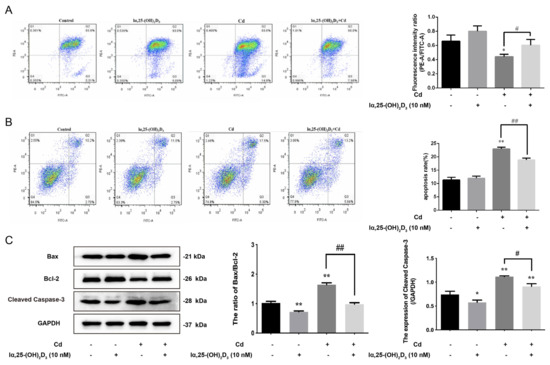The effects of lα, 25-(OH)2D3 on mitochondrial membrane potential and apoptosis in Cd- inhibited osteogenic differentiation of BMSCs from chickens in vitro. (A,B) The mitochondrial membrane potential and apoptosis rate were measured by flow cytometry after treatment with different groups. ## p < 0.01, # p < 0.05 vs. Cd group. (C) the ratio of Bax/Bcl-2 and the expression of cleaved caspase-3 were detected by Western blot after treatment with different groups. GAPDH was used as an internal reference protein. * p < 0.05, ** p < 0.01 vs. Control group; ## p < 0.01 vs. Cd group. (Control: only cells, lα, 25-(OH)2D3: 10 nmol/L; Cd: 5 μmol/L and lα, 25-(OH)2D3 + Cd: 10 nmol/L + 5 μmol/L, respectively).