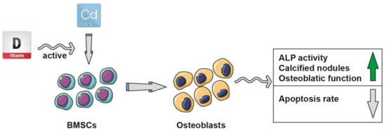 In conclusion, Cd has a toxicity role in BMSCs and/or osteogenic differentiation in chickens, and reduces osteogenic mineralization by promoting cell apoptosis in vitro. Moreover, lα, 25-(OH)2D3 facilitates the osteogenic differentiation and mineralization of BMSCs from chickens, and alleviates the Cd-induced toxicity of cells (Figure 6). However, the regulatory mechanisms by which 1α,25-(OH)2D3 mitigates Cd-stimulated toxicity need to be further investigated in detail.