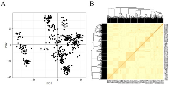 (A) The PCA plot of top two principal components. (B) The kinship matrix diagram.