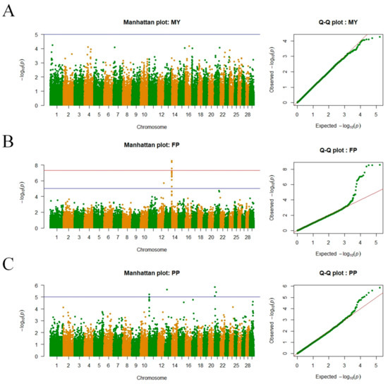 Manhattan plots and Q–Q plots from GWAS for MY, FP, and PP traits in Chinese Holstein cows. (A) MY: milk yield; (B) FP: milk fat percentage; (C) PP: milk protein percentage. In the Manhattan plot, above the blue horizontal line indicates a significant SNP chromosome level and above the red horizontal line indicates a significant SNP genomic level.