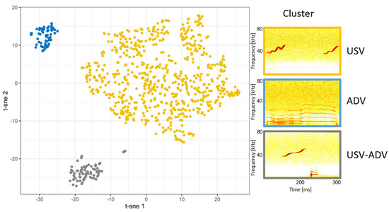 t-SNE plot visualizing results of unsupervised cluster analysis. Colors represent separate clusters matching the preliminary visual classification of the call types; USV—ultrasonic vocalization, ADV—audible vocalization, USV-ADV—transition from USV to ADV part.