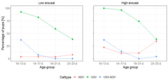 Percentage of pups producing ADVs, USVs and USV-ADVs in the Low and High arousal condition across Age groups; d. = postnatal days.