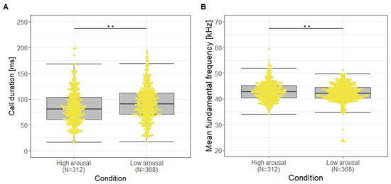 Boxplots for (A) Call duration and (B) Mean fundamental frequency of USVs during High and Low arousal condition. Boxplots represent lower and upper quartile, thick black line is the median, whiskers are the non-outlier range, yellow dots represent vocalizations plotted as a beeswarm, ** p < 0.01.