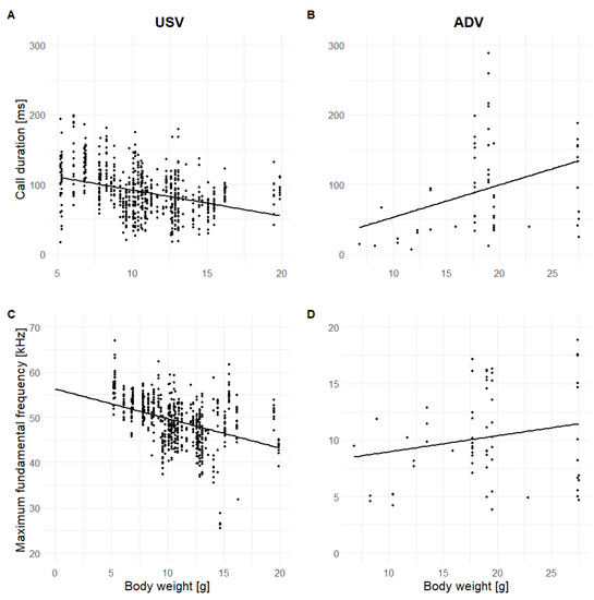 Scatterplots for (A) USV Call duration, (B) ADV Call duration, (C) USV Maximum fundamental frequency, and (D) ADV Maximum fundamental frequency across body weight. Dots = vocalizations, thick line = regression line.