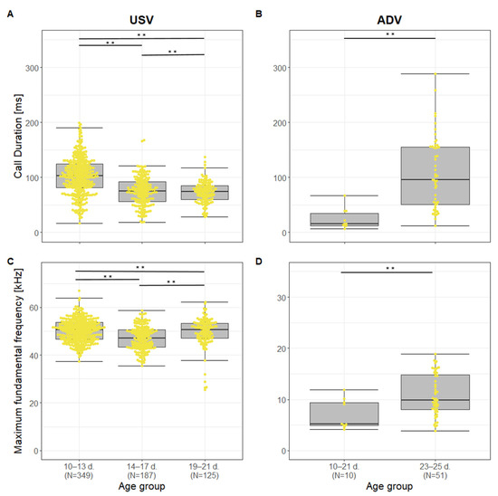 Boxplots for (A) USV Call duration, (B) ADV Call duration, (C) USV Maximum fundamental frequency and (D) ADV Maximum fundamental frequency across different Age groups. Boxplots represent lower and upper quartile, thick black line is the median, whiskers are the non-outlier range, yellow dots represent vocalizations plotted as a beeswarm, d. = postnatal days; ** p < 0.01.