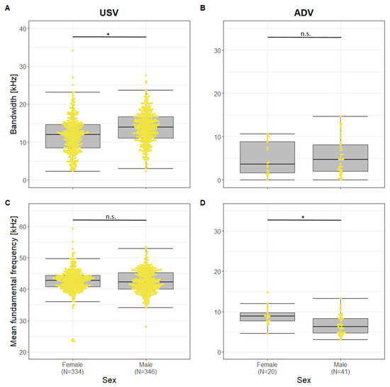Boxplots for (A) USV Bandwidth and (B) ADV Bandwidth, (C) USV Mean fundamental frequency and (D) ADV Mean fundamental frequency for females and males. Boxplots represent lower and upper quartile, thick black line is the median, whiskers are non-outlier range, yellow dots represent vocalizations plotted as a beeswarm, * p < 0.05, n.s. = non-significant differences.