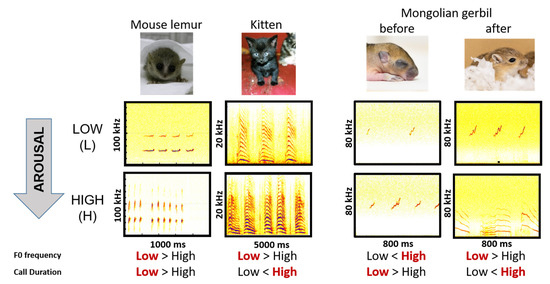 - Zaytseva, A.S.; Volodin, I.A.; Ilchenko, O.G.; Volodina, E.V. Discomfort-Related Changes in Pup Ultrasonic Calls of Fat-Tailed Gerbils Pachyuromys duprasi. Bioacoustics 2017, 26, 1–13. [Google Scholar] [CrossRef]