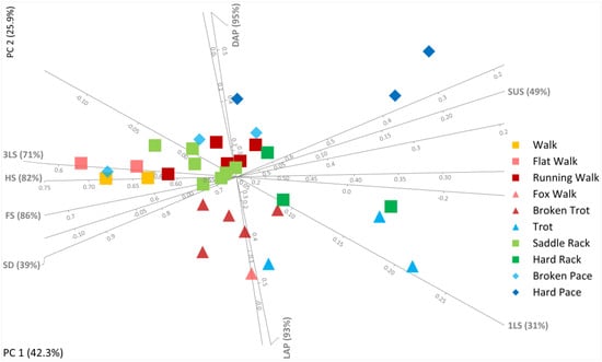 Modified Hildebrand diagram for symmetrical horse gaits, plotting lateral advanced placement [LAP] (limb phasing value or % of stride duration separating ipsilateral foot contacts) vs. hind foot stance duration [HS] (duty factor or % of stride duration hind feet are on the ground), as well as stride duration [SD] (seconds), front foot stance duration [FS], seconds, percentage of tripedal support throughout stride duration [3LS], percentage of unipedal support throughout stride duration [1LS], and percentage of stride duration spent in suspended phases where all four feet are off the ground together [SUS]. Values following these abbreviations show what percentage of principal component is based on the given parameter. Square gaits (walk, flat walk, running walk, saddle rack, hard rack) are symbolized by a square, diagonal couplet gaits (fox walk, broken trot (i.e., fox trot), and trot) are symbolized by a diamond, and lateral couplet gaits (broken pace (i.e., stepping pace) and hard pace) are symbolized by a triangle. Square gaits tend to have longer stride durations (and duty factors), with diagonal gaits intermediate in value, and lateral gaits (and asymmetrical gaits) with the least stride durations. Diagonal gaits have the largest lateral advanced placements (limb phasing values) while lateral gaits have the smallest. Data points are averaged values from the following sources [2,15,23,30,42,43,50].