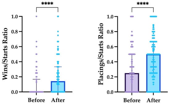 Scatter plots showing the medians (bars) and IQRs (fine lines with serifs) of wins/starts and placings/starts ratios in the study population, before and after hospitalization. Statistical significance is shown as **** (p < 0.0001) and was obtained by Wilcoxon test.