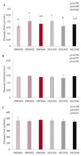 Plasmatic concentrations of (A) monoamine oxidase (MAO), (B) diamine oxidase (DAO) and (C) total antioxidant capacity (TAC) of dogs after 30 days of feeding with poultry by-product meal (PBPM, red columns) or hydrolyzed chicken liver (HCLP, black columns) diet at three crude protein concentrations (24, 32 or 40% CP). Results were expressed as mean ± standard deviation. Results were analyzed by two-way ANOVA. p1: comparison between protein sources (PBPM or HCLP); p2: comparison between different protein concentrations; p3: interaction between types of protein source and protein concentration. Different lowercase letters indicate significant differences according to Tukey post hoc test (p < 0.05 or 0.01).