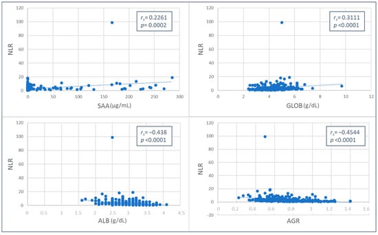 Spearman’s Rho correlation between neutrophil-to-lymphocyte ratio (NLR) and serum amyloid A (SAA), globulins (GLOB), albumin (ALB) values, and albumin-to-globulin ratio (AGR).
