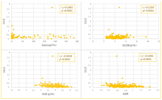 Spearman’s Rho correlation between monocyte-to-lymphocyte ratio (MLR) and serum amyloid A (SAA), globulins (GLOB), albumin (ALB) values, and albumin-to-globulin ratio (AGR).