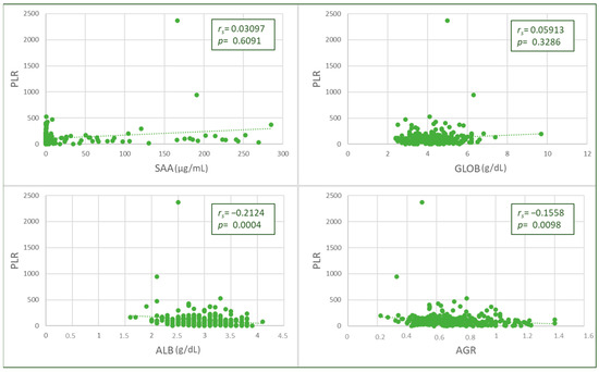 The PLR value was negatively and weakly correlated with albumin (p = 0.0006, rs = −0.2174) and AGR values (p = 0.0088, rs = −0.1658), and no significant correlations were found with SAA or globulins (Figure 3). Higher PLR values were found in cats with hypoalbuminemia (Table 2).