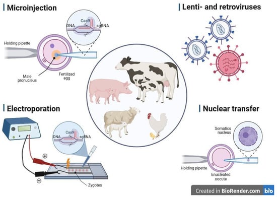 Most popular methods of gene delivery successfully applied in livestock biotechnology. This figure was created with BioRender.com (accessed on 15 June 2023).