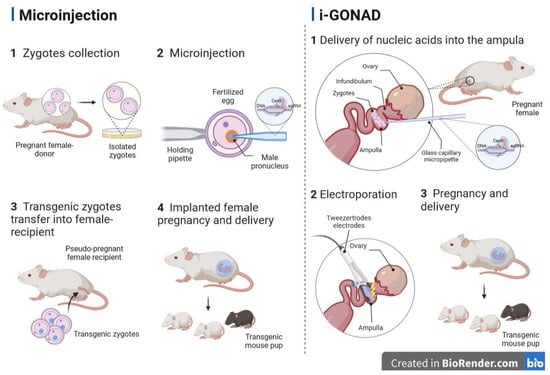 A schematic comparison between microinjection and improved genome editing via oviductal nucleic acid delivery (i-GONAD). Figure created with BioRender.com (accessed on 15 June 2023).
