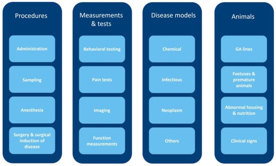 Diagram of main categories (dark blue) and subcategories (light blue)—animal procedures are subdivided into 16 subcategories. Based on commonalities, these subcategories were assigned to four main categories of procedures.