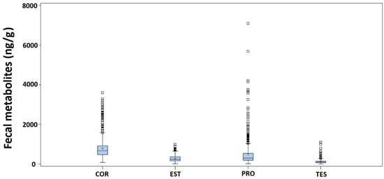 Box and whisker plots for the fecal cortisol (COR), estrone (EST), progesterone (PRO), and testosterone (TES) metabolites (ng/g of dry feces) measured in the 15 animals included in the study.