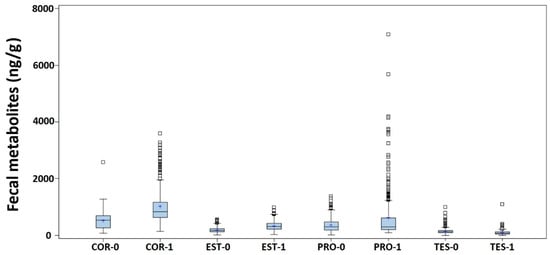 Box and whisker plots for the fecal cortisol (COR), estrone (EST), progesterone (PRO) and testosterone (TES) metabolites (ng/g of dry feces) measured in the 15 animals (males = 0, females = 1) included in the study.